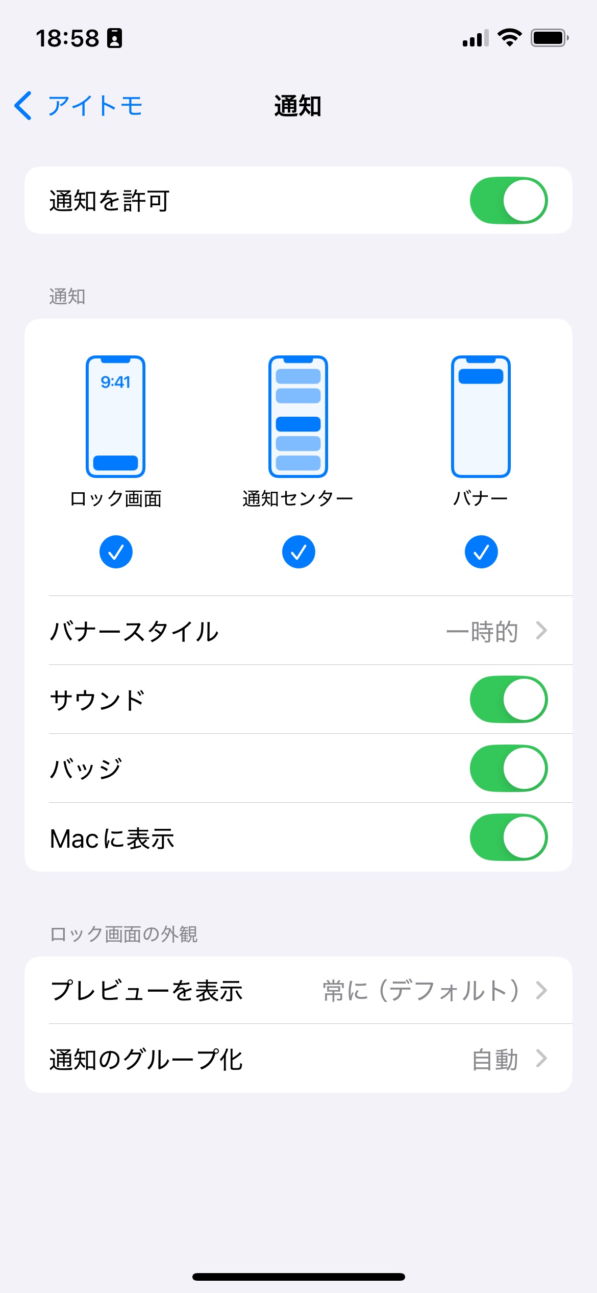 [設定] > [通知] > [アイトモ] > 「通知を許可」「バナースタイル」「サウンド」「バッジ」などをONにしてください。