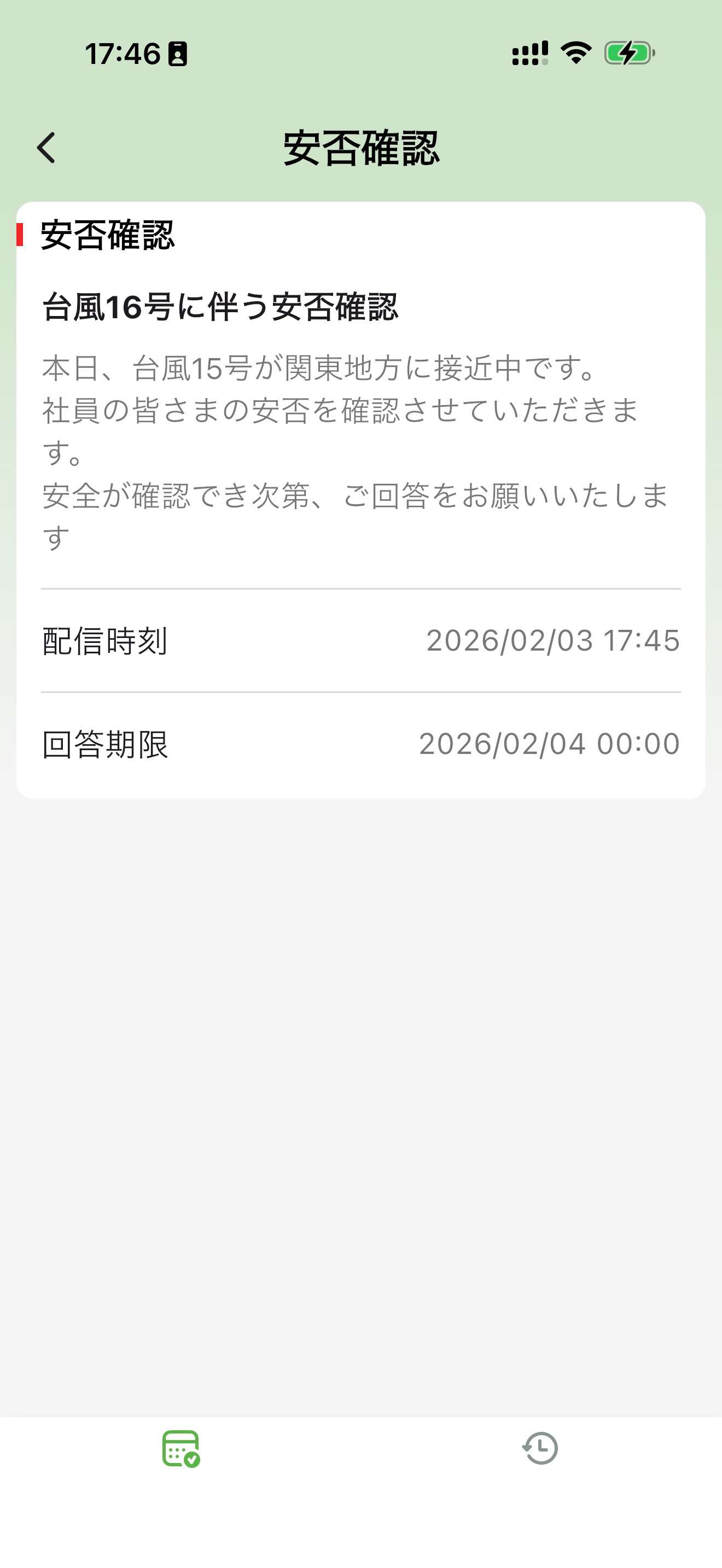 安否確認の詳細画面では、管理者からのメッセージ内容と回答期限を確認し、そのまま回答を入力できます。
