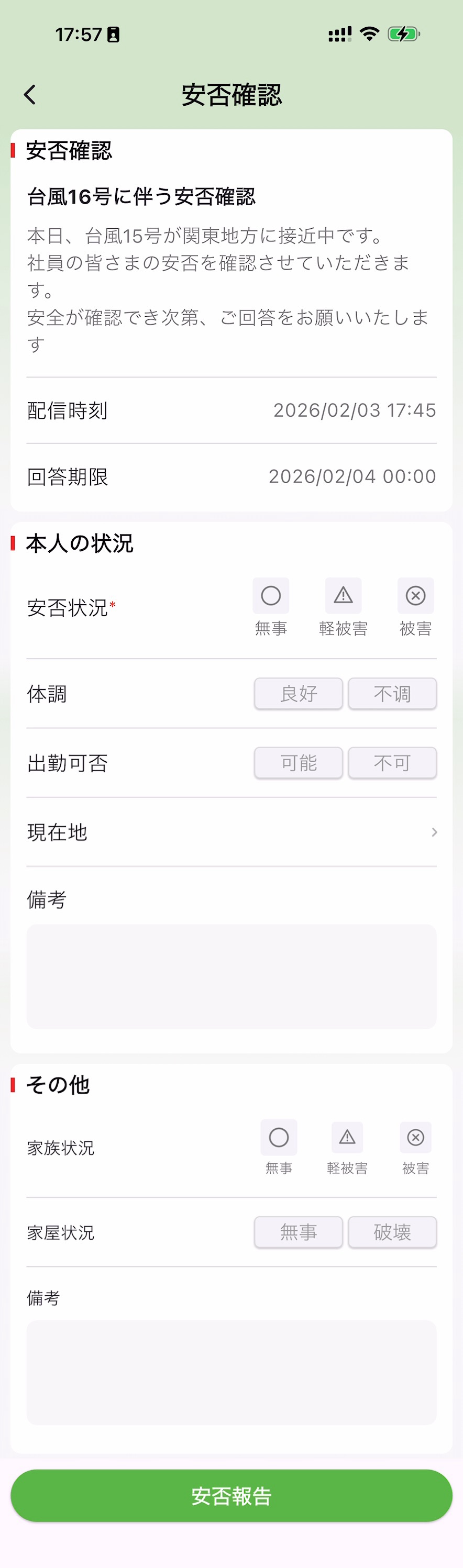 災害時の迅速な対応のため、安否確認には正確かつ速やかに回答してください。 状況が変化した場合は、回答期限内であれば修正が可能です。