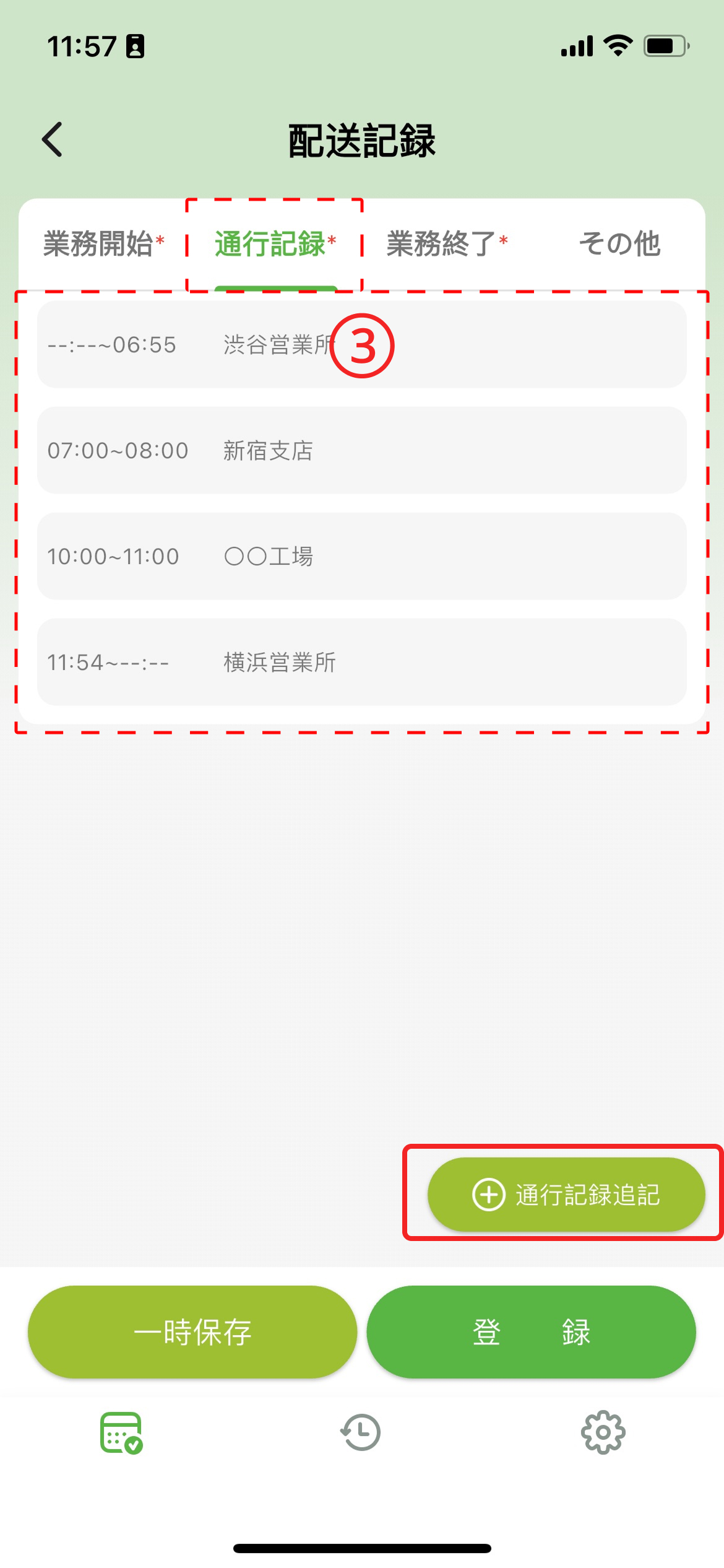配送記録の際は、下記のステップ順に入力し、「登録」ボタンをタップします。