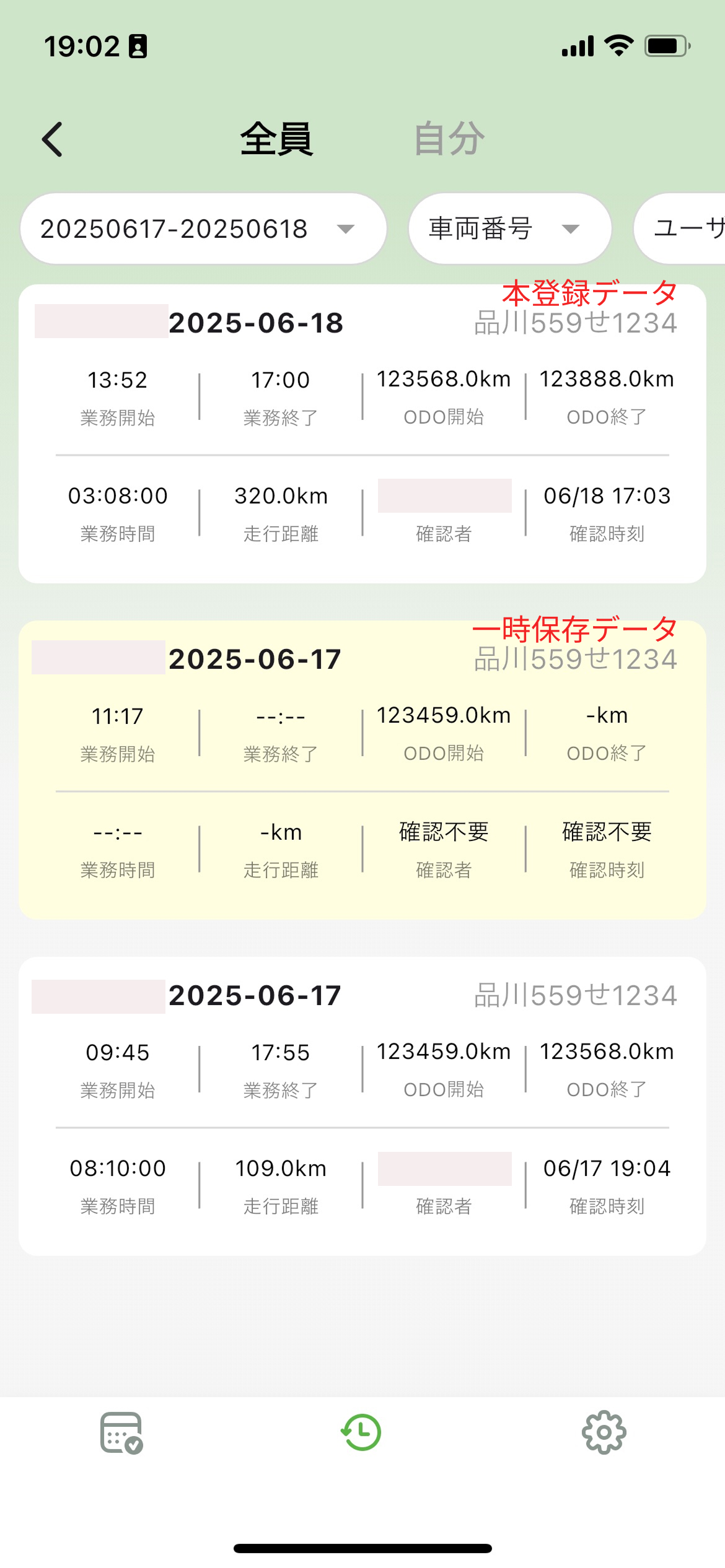 - 車両番号:使用した車両番号(※追加方法は「3.3.1 車両番号の追加」を参照)