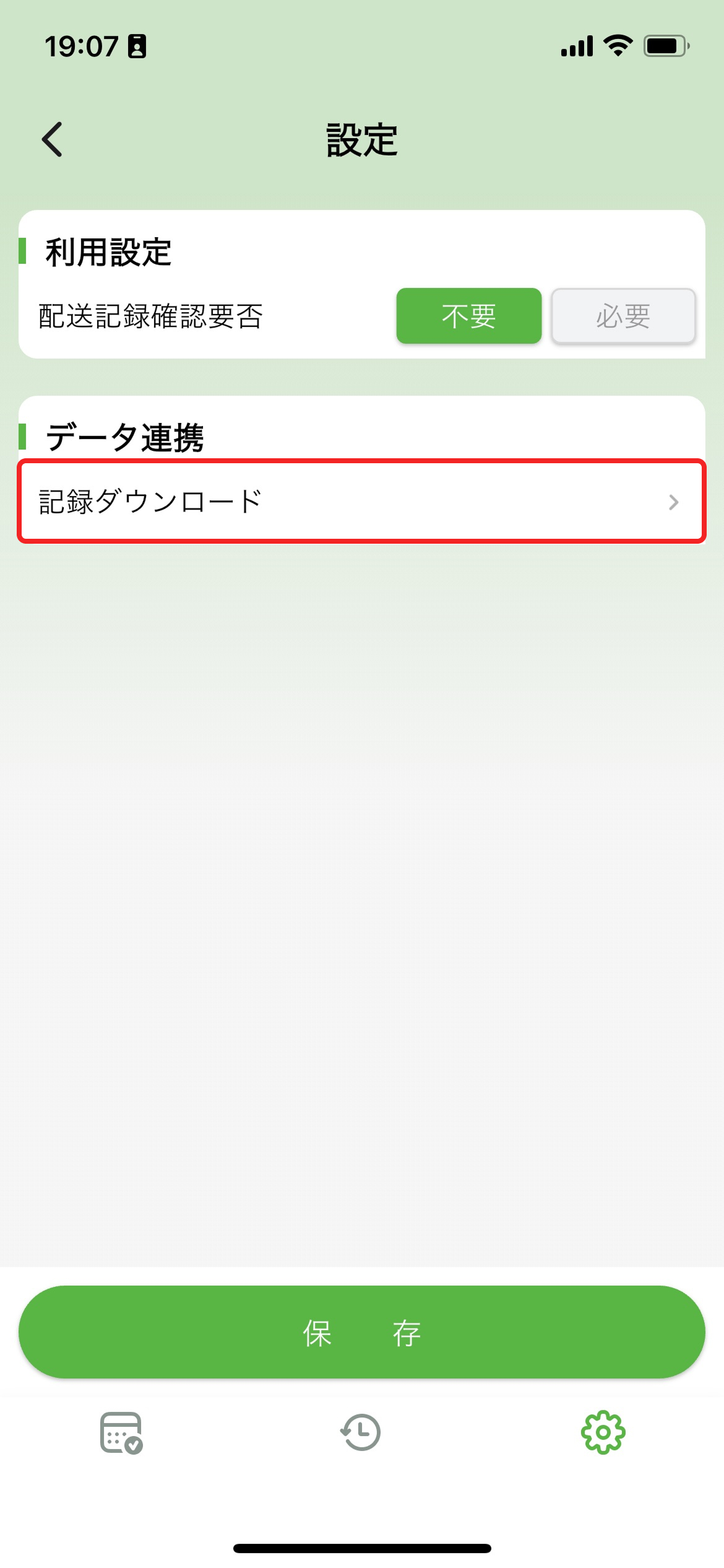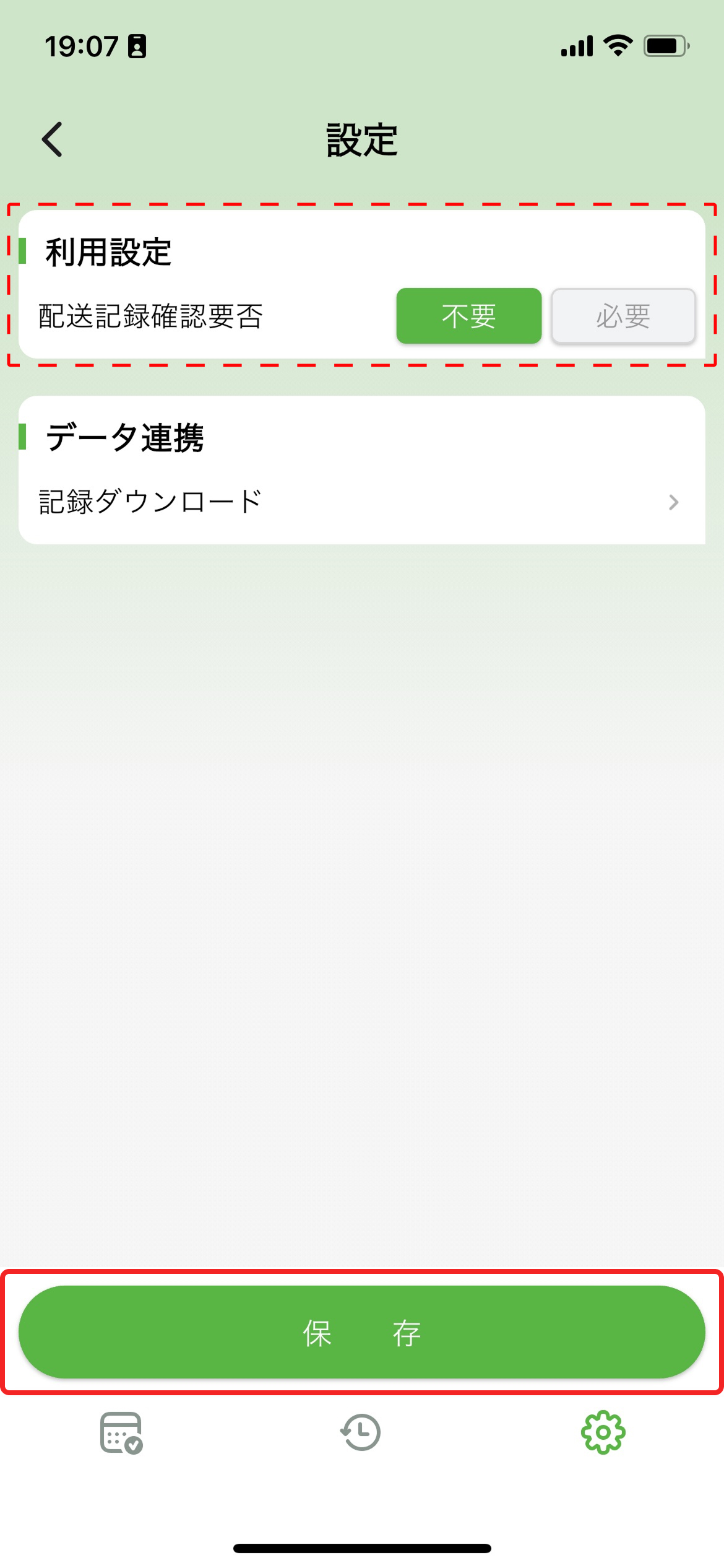 - 「不要」:配送記録の確認が不要です。※確認者はアプリ登録者本人です。