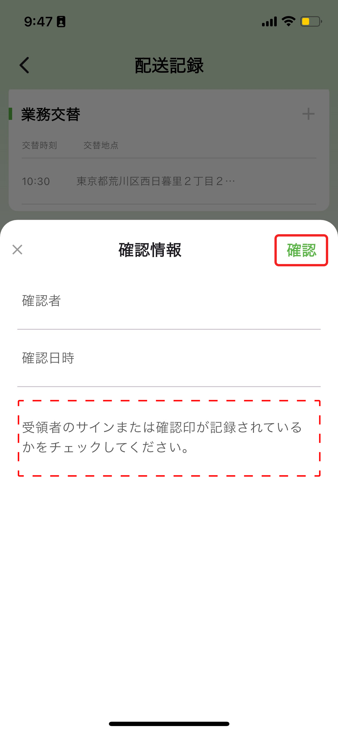- 配送記録画面で、左にスワイプして「業務交替」画面を表示します。