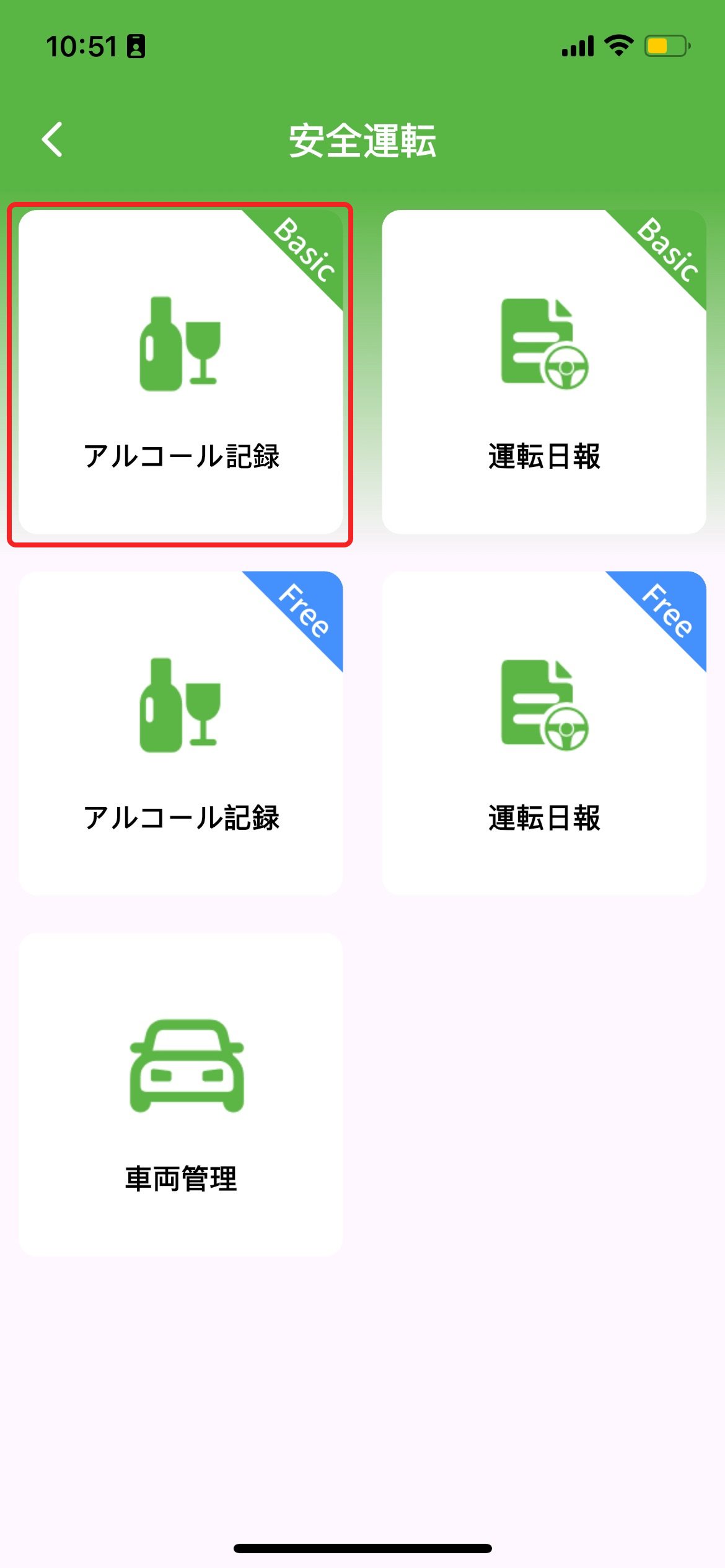 - 安全運転画面(右図)で「アルコール記録(Basic)」をタップ