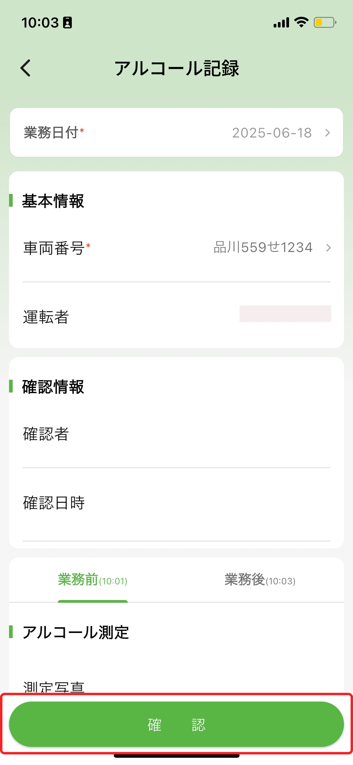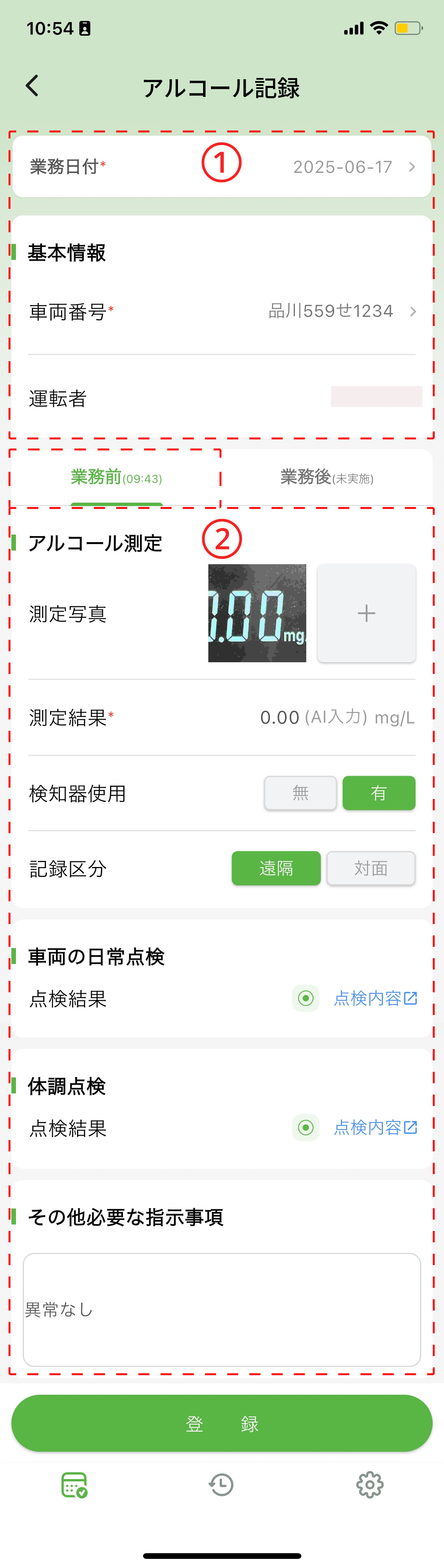業務前アルコール記録の際は、下記の項目を入力し、「登録」ボタンをタップします。
