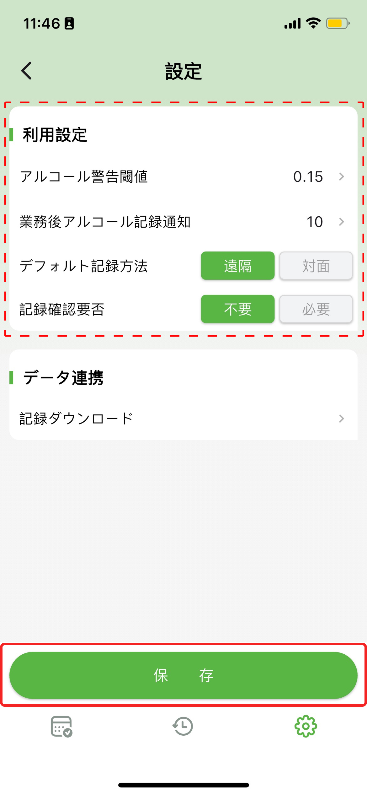 - アルコール記録確認要否:アルコール記録の確認要否を設定できます。