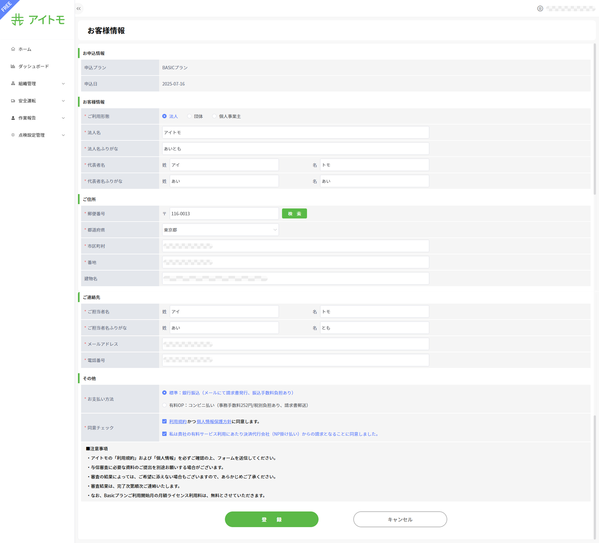 - 画面遷移:メニュー > ホームページ > 「Basicプラン申し込み」ボタンを押下 > お客様情報申請フォーム