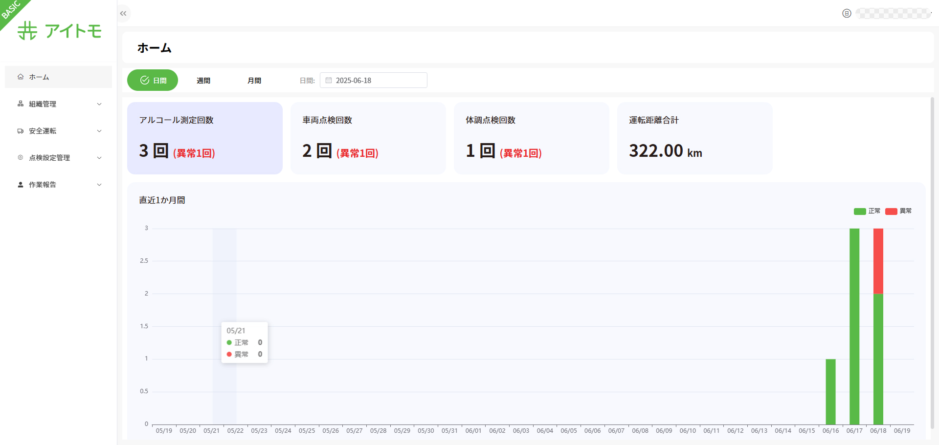 - グラフエリア 直近1か月間の記録を時系列で表示しています。緑色の棒は「正常」な記録、赤色の棒は「異常」な記録として視覚的に区別され、傾向の把握や異常の早期発見に役立ちます。