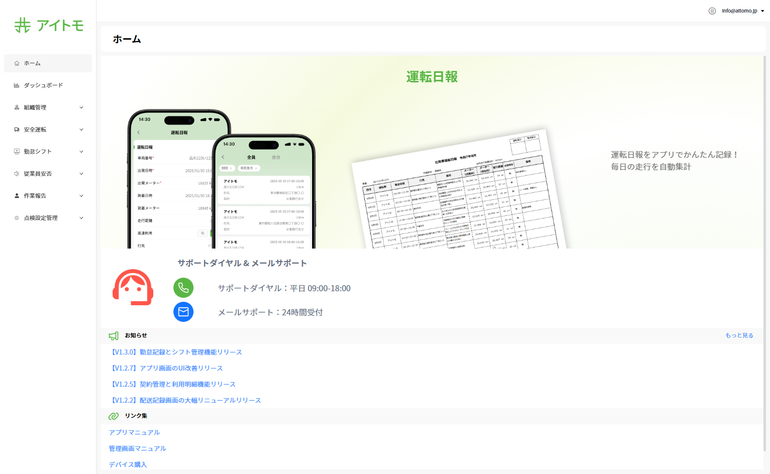 ホーム画面は、アイトモの入口画面であり、最新のお知らせやサポート情報にすぐアクセスできるページです。