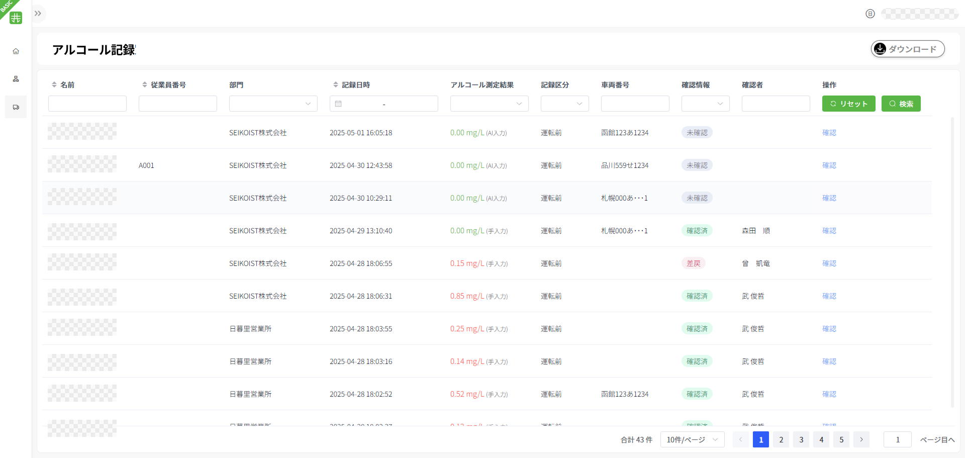 - 機能概要:従業員のアルコール測定日時、測定者、測定結果等の情報を記録します。管理者は従業員の日々の作業状況を確認できます。日付、測定者、測定結果等の条件で検索可能です。