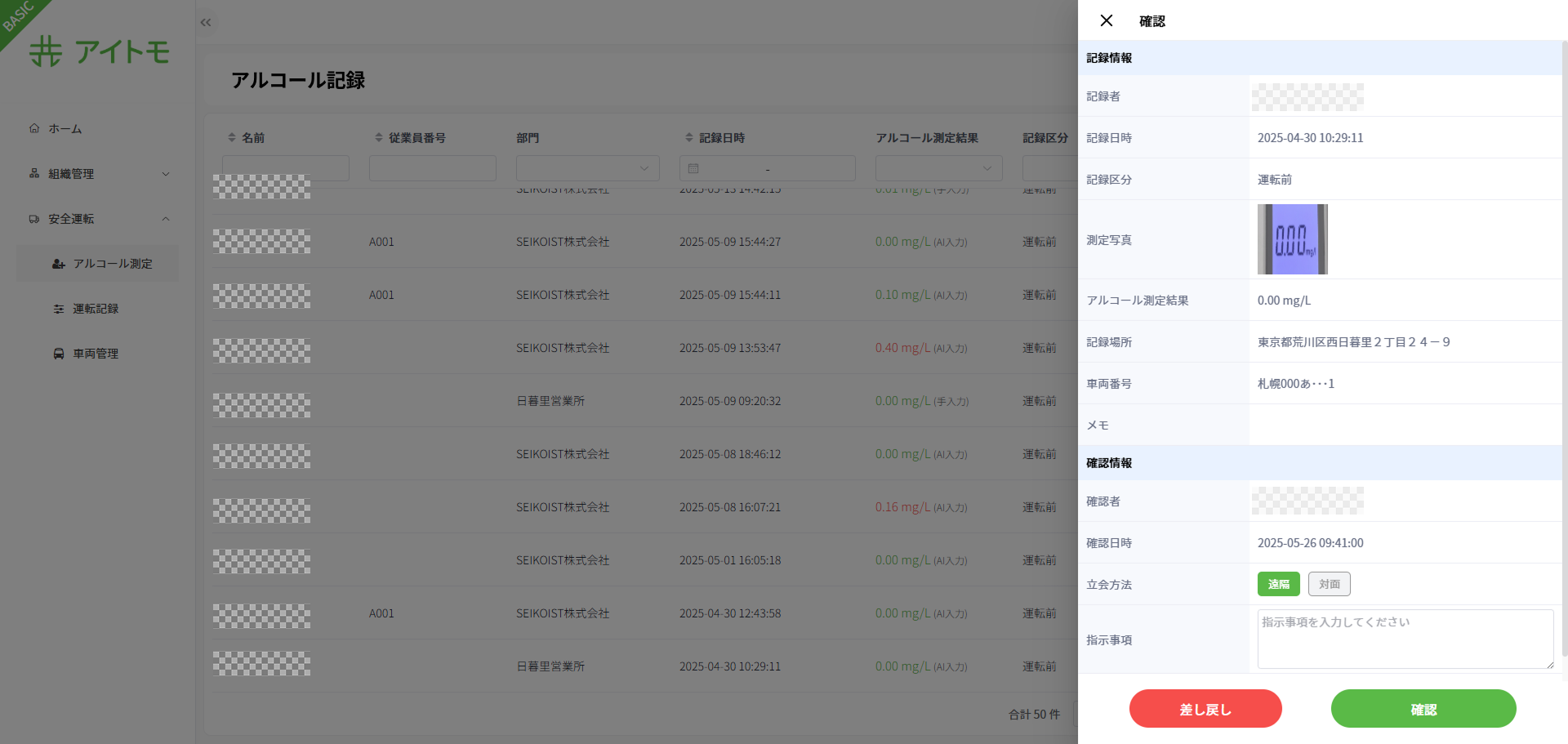 ※デフォルト立会方法は組織設定で設定できます、「3.1.3 組織設定」をご参考してください。 - 指示事項: 確認した記録に対して、ドライバーや従業員への注意事項や指示等を記録できます。