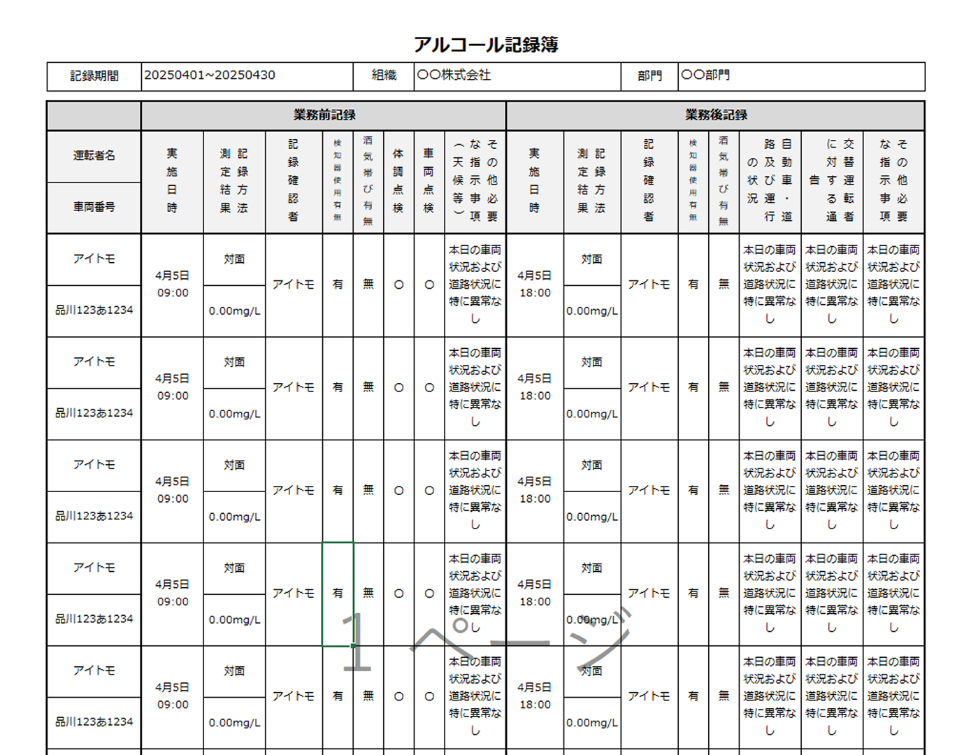 - 機能概要:運転者の日々のアルコール記録情報(記録日付、実施者、車両番号、記録時刻、アルコール濃度、車両点検、体調状況など)を記録します。管理者は一覧画面で日付、車両番号、運転者などの条件で検索し、アルコール記録の実施状況を確認できます。