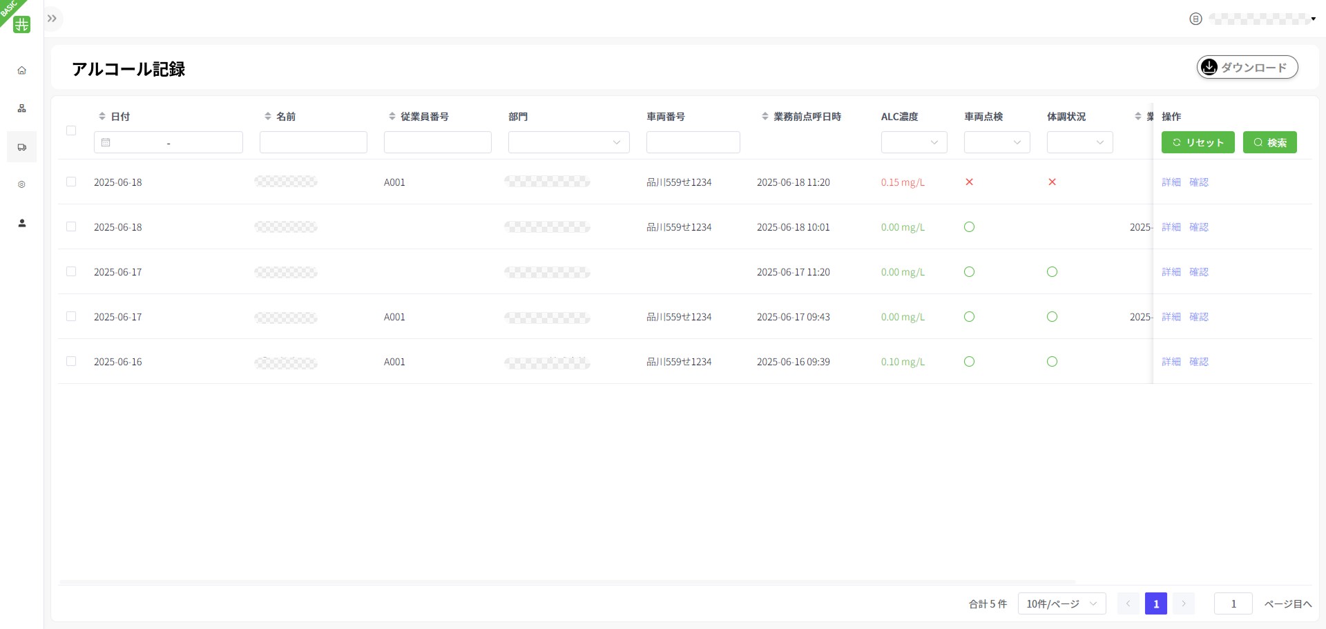 登録済みのアルコール記録を一覧表示します。日付、車両番号、運転者などの条件で検索が可能です。