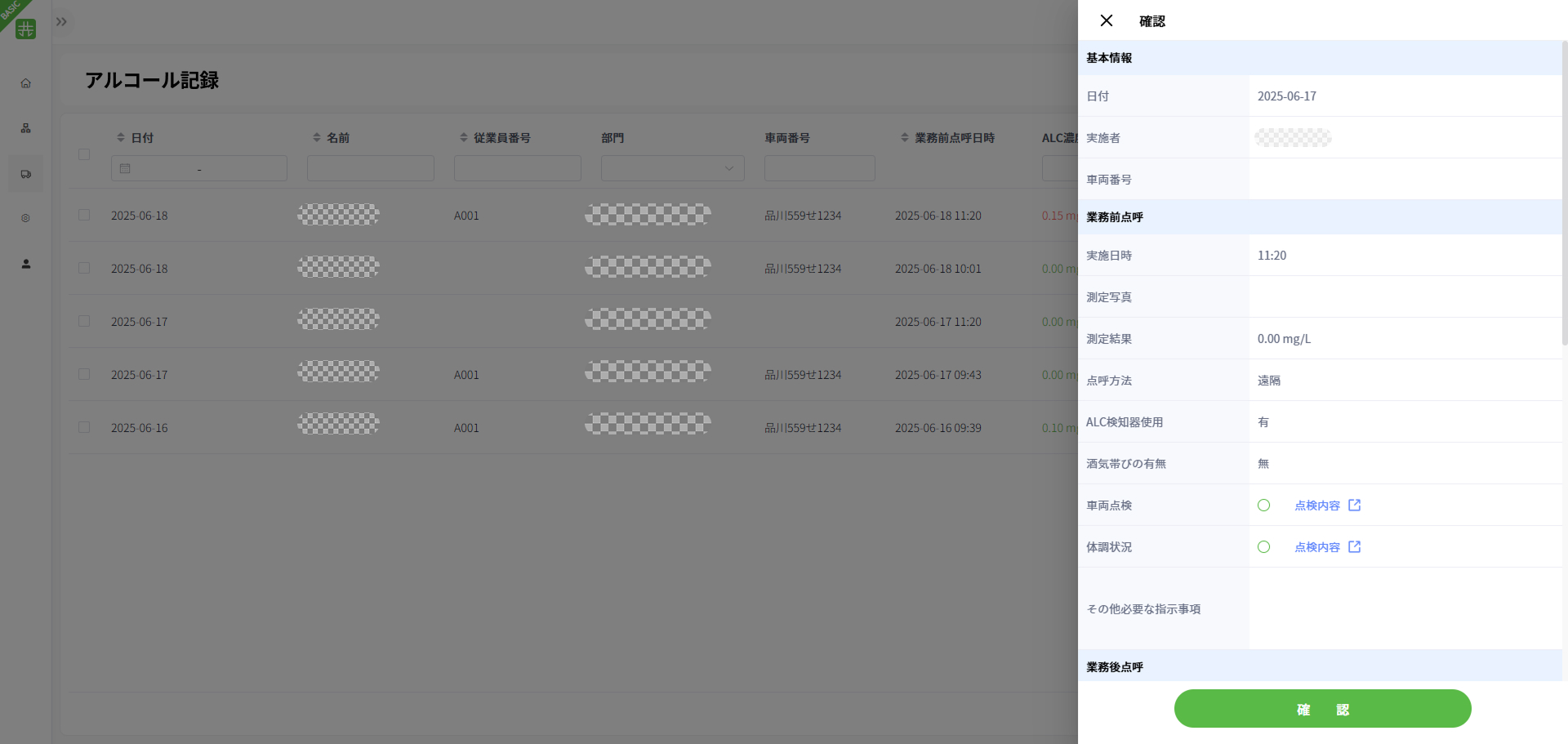 アルコール記録の詳細画面です。記録日付、実施者、車両番号、記録時刻、ALC濃度、記録方法、ALC検知器使用有無、酒気帯び有無、車両点検、体調状況、その他指示事項などの詳細情報を確認できます。